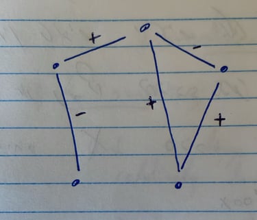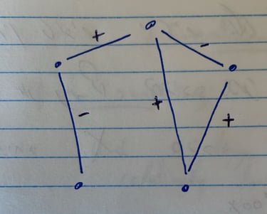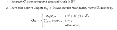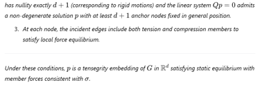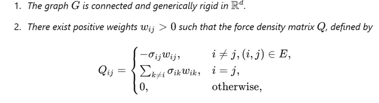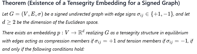 אז ניקח את הגרף שלנו, נוודא שהוא עומד בתנאים מסוימים (ואם לא, נשנה אותו קצת...), ואז נשכן אותו במרחב אוקלידי רב מימדי כך שצלעות [+] יתפקדו כאלמנטי דחיסה (מוטות), צלעות [-] יתפקדו כאלמנטי מתיחה (כבלים), ושהמערכת כולה תהיה בשיווי משקל.