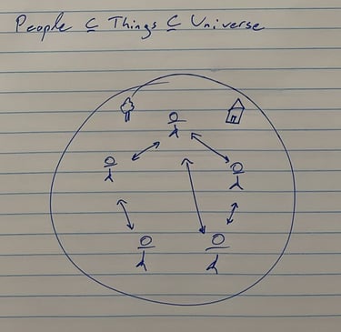 אז יש עולם, ויש בו כלמיני דברים וגם אנשים, ועכשיו ניזהר מאוד שלא לחלק אותם לקבוצות של יהודים וערבים ודתיים וחילונים וימנים ושמאלנים ודרוזים ובמקום זה נתמקד ביחסים בינהם, כי היחסים האלו יהיו אבני הבניין הבסיסיות שלנו.